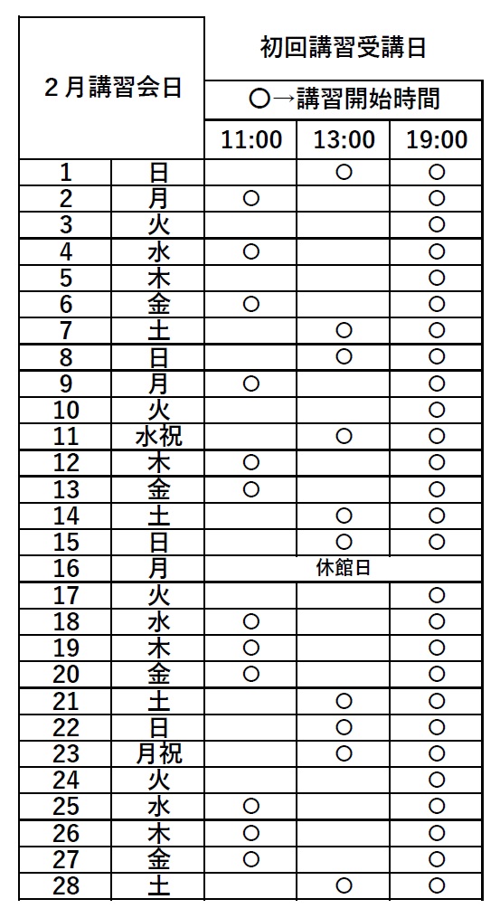 ■初回講習は「○」のついた日時に実施します。やむなく変更となる可能性もありますので、来館前にご確認ください。