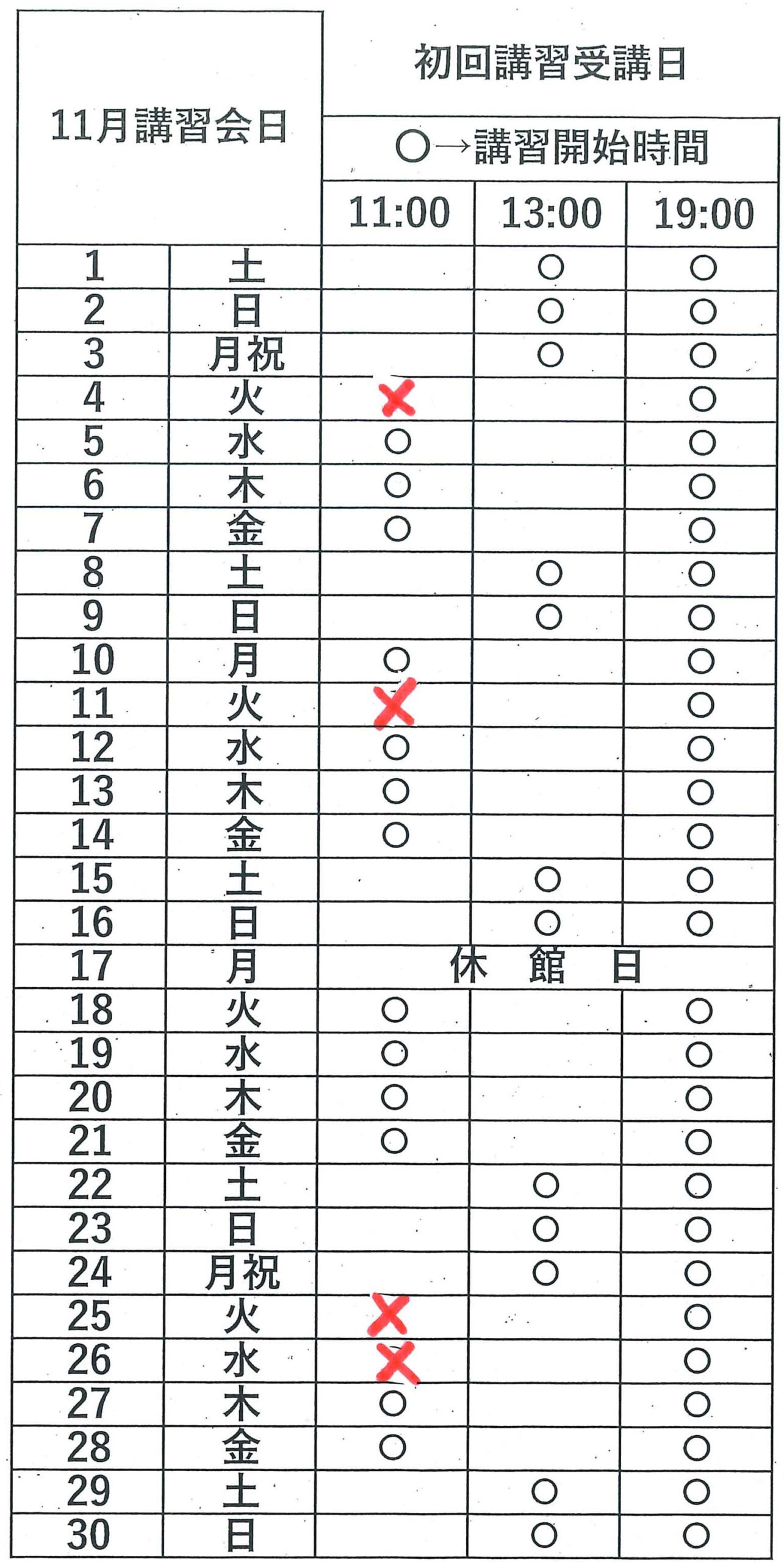 ■初回講習は「○」のついた日時に実施します。やむなく変更となる可能性もありますので、来館前にご確認ください。